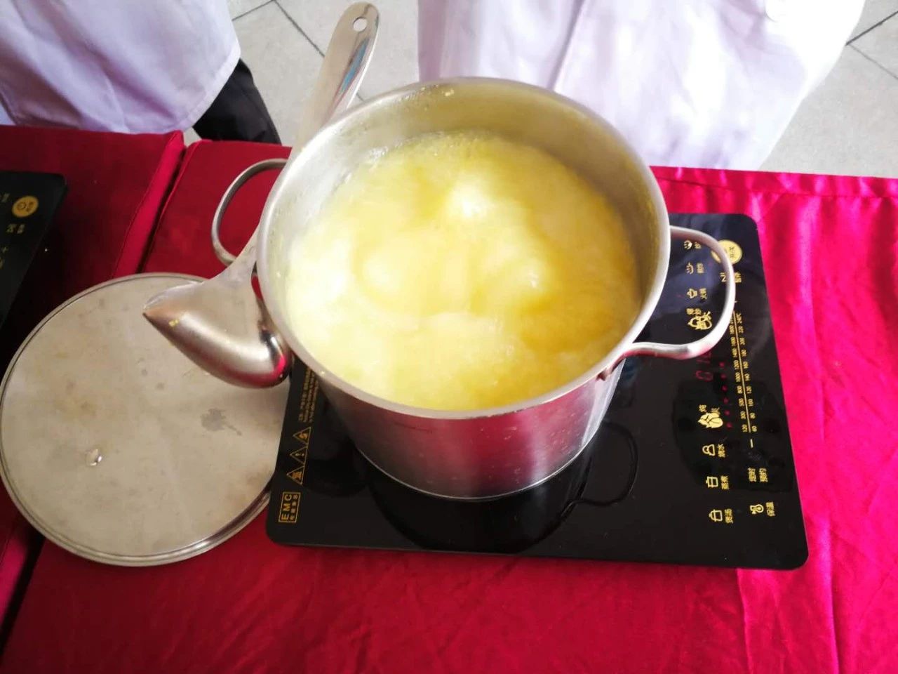 工作人員正在熬煮小米